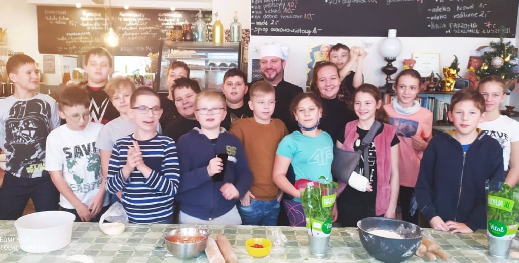 8.12.2021r. uczniowie klasy 5A wybrali się do restauracji „KarmaMa Bistro i Zioło” na warsztaty. Wszyscy mieli możliwość samodzielnie zrobić ciasto na prawdziwie włoską pizzę, potem wybrać ulubione dodatki. A wszystko to odbywało się pod czujnym okiem Szefa kuchni. Pizza była przepyszna, bo zrobiona własnymi rękami. Dzieci nie tylko robiły pizzę, ale dużo dowiedziały się o jej pochodzeniu i poznały tajniki jej właściwego wykonania. A jedną kulkę ciasta uczniowie zabrali do domu.Było ciekawie i smacznie.
